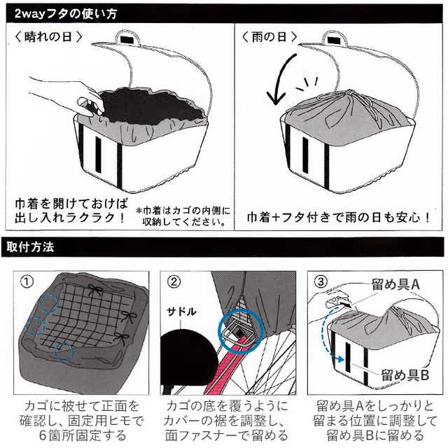 自転車 かごカバー 後ろ 通販 防水加工 巾着タイプ 撥水 はっ水 おしゃれ かわいい かご バスケット カバー フタ付き 雨よけ 荷物 飛び出し防止 盗難防止 Chou Chou Poche シュシュポッシュ 自転車後ろかごカバー バイカラー サイクリング バイカラーネイビー